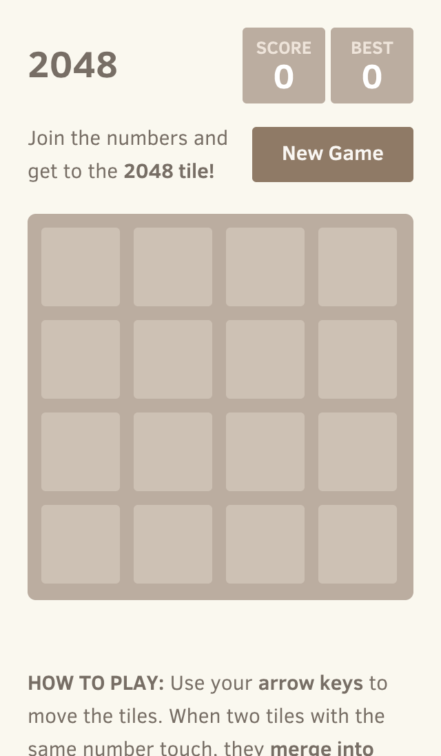 Como jogar: Use as setas do teclado para mover os blocos. Quando dois blocos com o mesmo número se tocam, eles se fundem em um só!